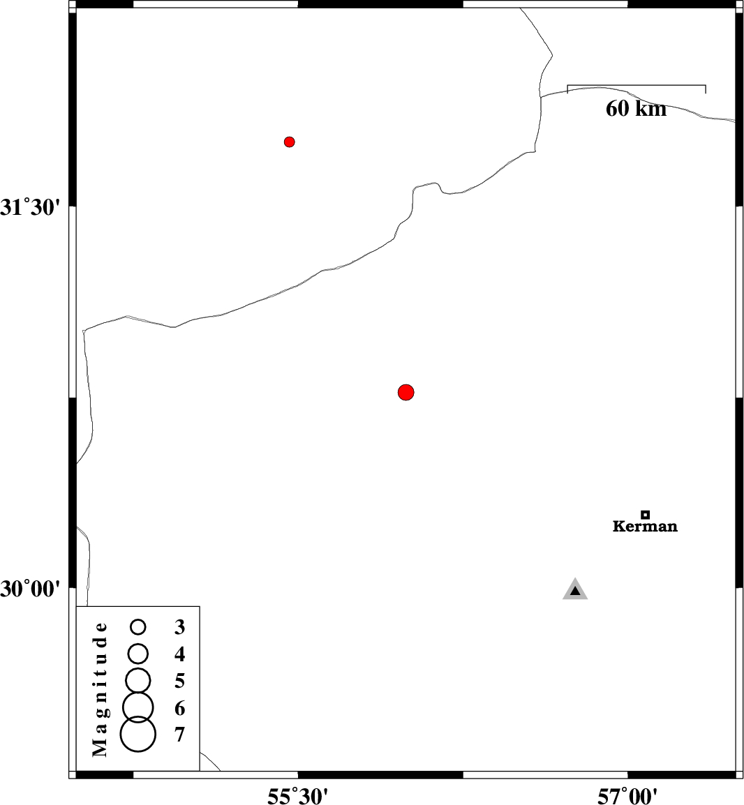 | 2013/04/17 | 18:36:20.3 | 23:06:20.3 | 30.77 | 55.99 | 18 | ML3.3 | Kerman Province, 41 km North of Rafsanjan | ||