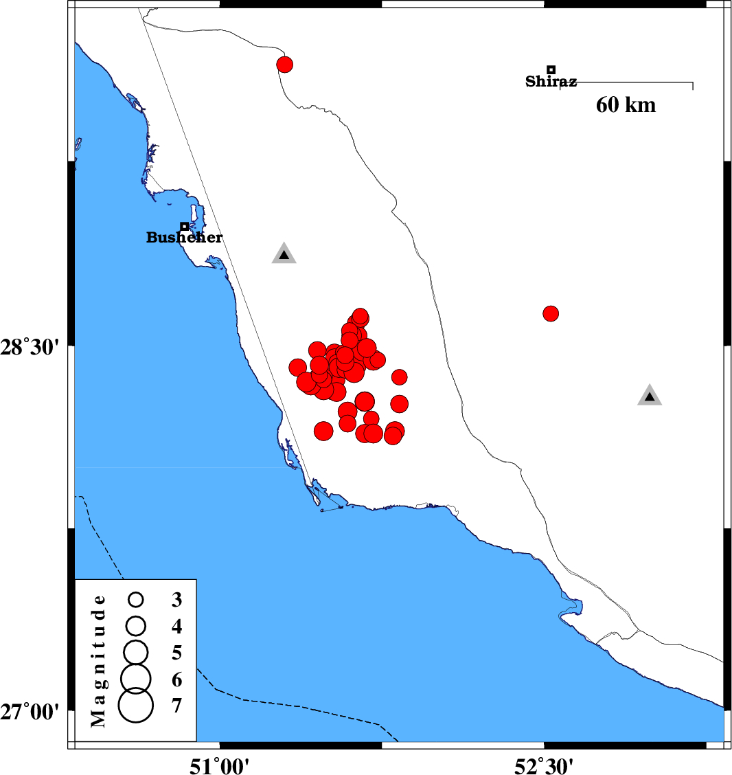 | 2013/04/14 | 05:21:49.2 | 09:51:49.2 | 28.49 | 51.68 | 17 | ML4 | Bushehr Province, 35 km South-East of Khormog | ||