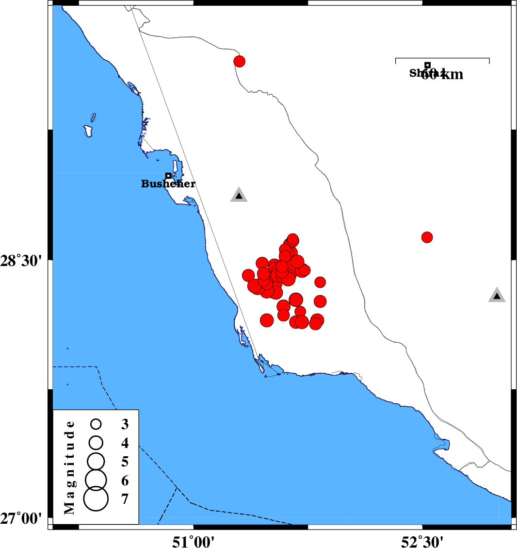 | 2013/04/11 | 09:41:22.4 | 14:11:22.4 | 28.47 | 51.53 | 25 | ML3.7 | Bushehr Province, 26 km South-East of Khormog | ||