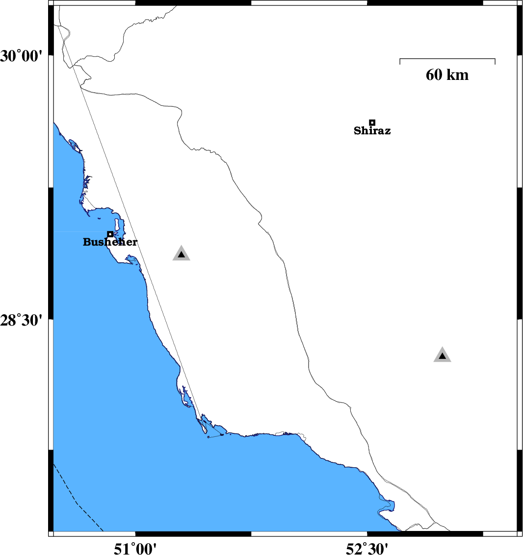 | 2013/04/19 | 15:44:12.6 | 20:14:12.6 | 28.78 | 51.97 | 17 | ML3 | Bushehr Province, 16 km West of Farashband | ||