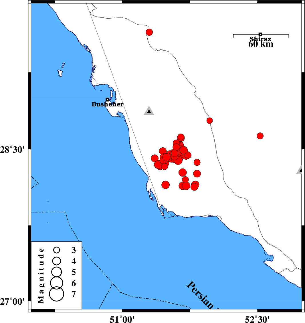 | 2013/04/19 | 11:25:54.2 | 15:55:54.2 | 28.33 | 51.47 | 14 | ML3.3 | Bushehr Province, 37 km South of Khormog | ||