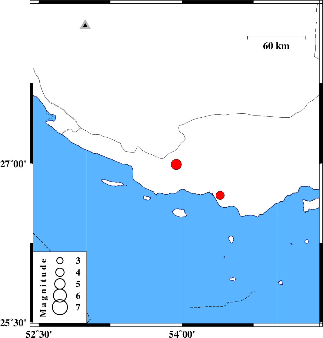| 2013/03/28 | 19:53:27.6 | 00:23:27.6 | 26.7 | 54.4 | 14 | ML3.9 | Hormozgan Province, 56 km South of Bastak |