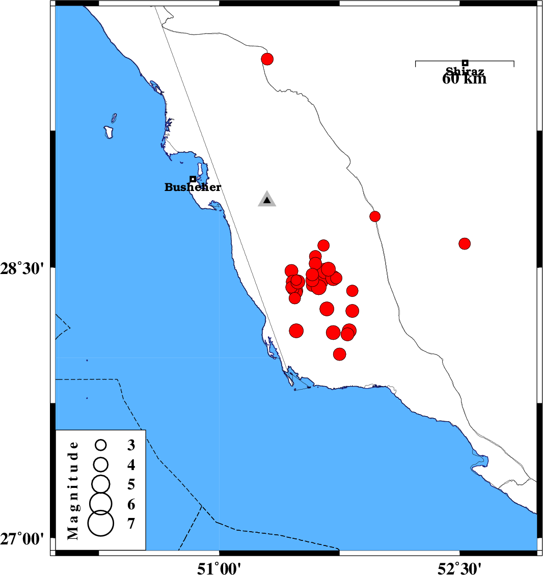 | 2013/04/14 | 05:21:49.2 | 09:51:49.2 | 28.49 | 51.68 | 17 | ML4 | Bushehr Province, 35 km South-East of Khormog | ||