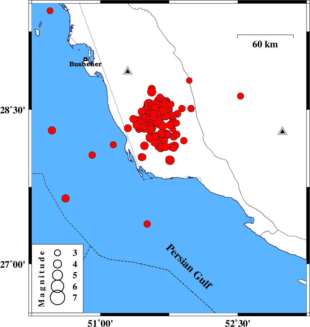 | 2013/04/09 | 14:44:54.2 | 19:14:54.2 | 28.52 | 51.53 | 30 | ML4.6 | Bushehr Province, 21 km South-East of Khormog | ||