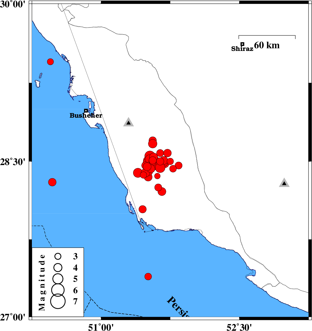 2013/04/09 22:20:45.9 02:50:45.9 28.4551.525 ML4 Bushehr Province, 26 km South-East of Khormog