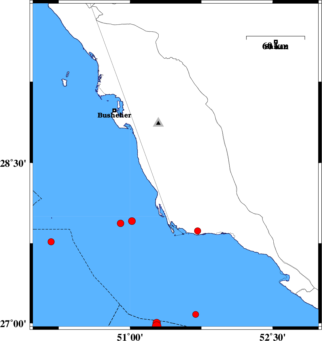 | 2013/04/12 | 07:20:21.9 | 11:50:21.9 | 28.45 | 51.53 | 27 | ML3.6 | Bushehr Province, 27 km South-East of Khormog | ||