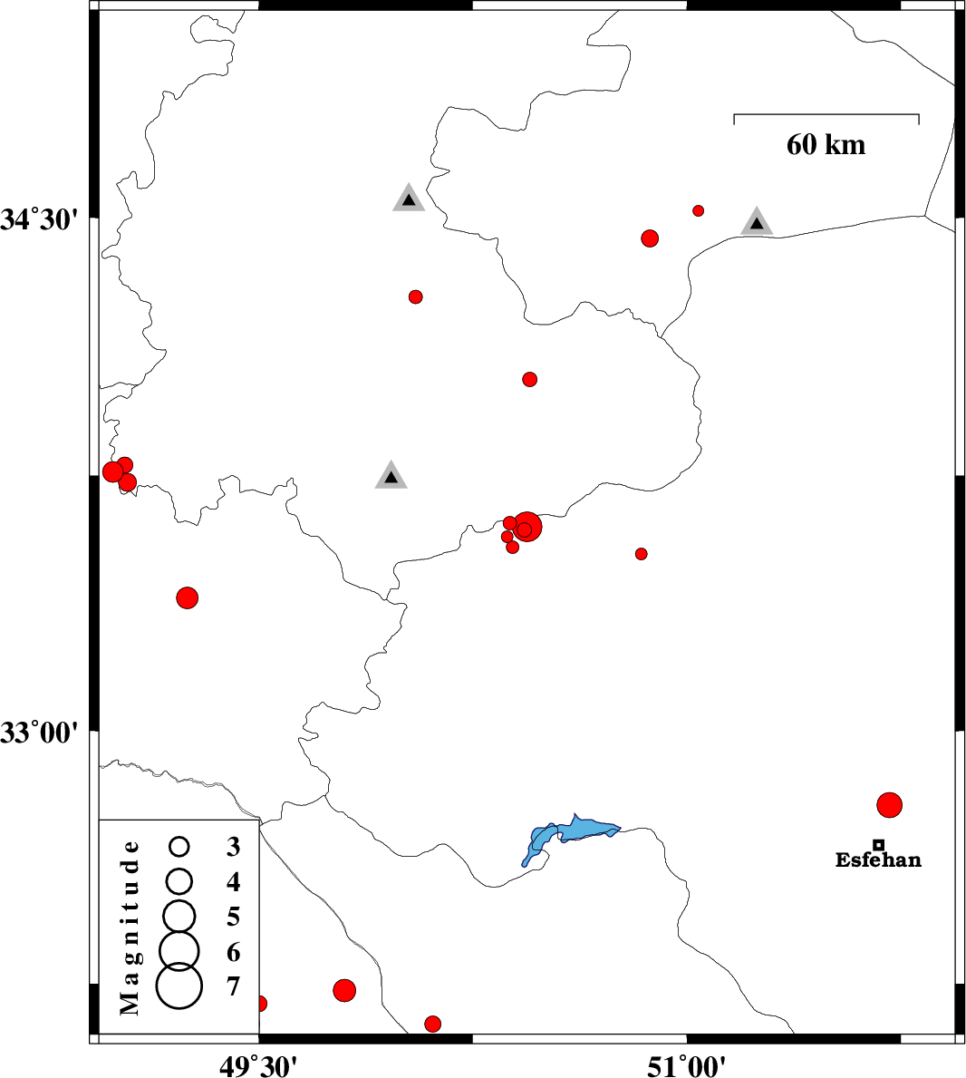 | 2013/04/19 | 20:22:34.6 | 00:52:34.6 | 32.78 | 51.71 | 14 | ML4 | Esfahan Province, 13 km North of Esfahan | ||