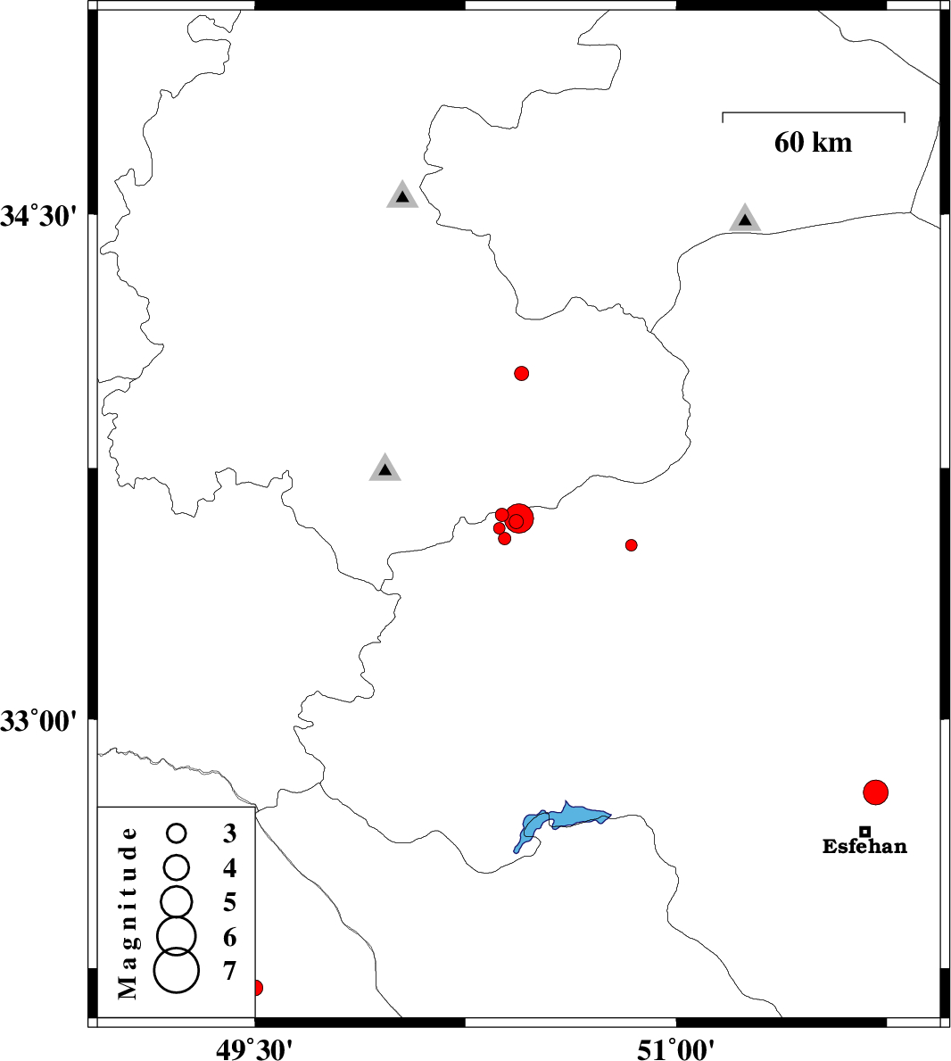| 2013/04/24 | 03:08:25.3 | 07:38:25.3 | 33.6 | 50.44 | 9 | ML4.6 | Esfahan Province, 21 km North-East of Golpayegan | ||