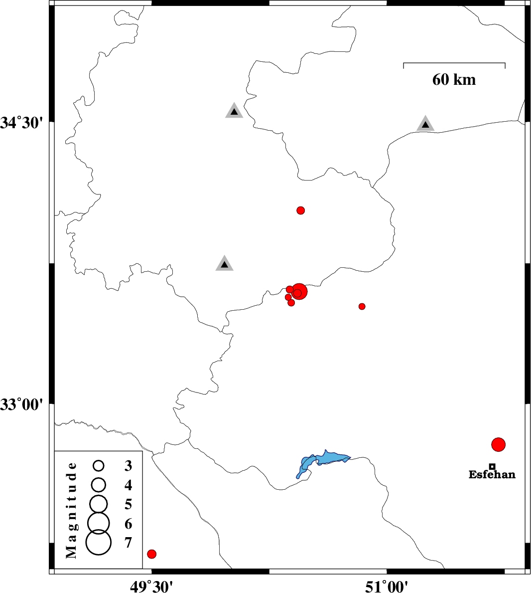 | 2013/04/24 | 03:08:25.3 | 07:38:25.3 | 33.6 | 50.44 | 9 | ML4.6 | Esfahan Province, 21 km North-East of Golpayegan | ||