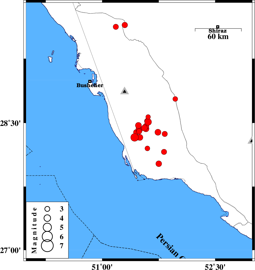 | 2013/04/19 | 15:44:12.6 | 20:14:12.6 | 28.78 | 51.97 | 17 | ML3 | Bushehr Province, 16 km West of Farashband | ||