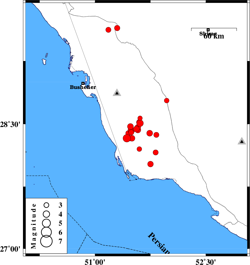 | 2013/04/19 | 18:32:57.5 | 23:02:57.5 | 28.42 | 51.49 | 29 | ML4 | Bushehr Province, 28 km South-East of Khormog | ||