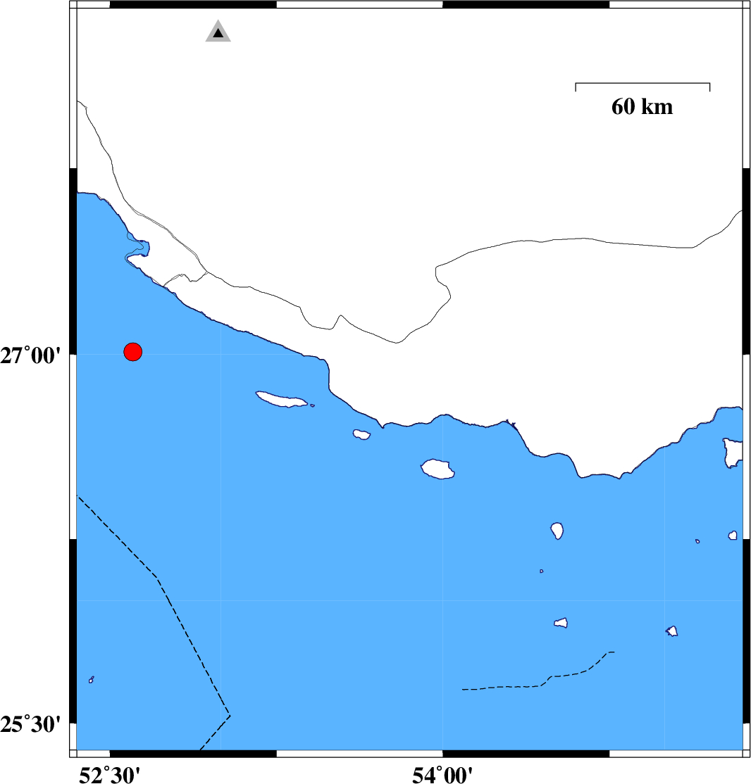 | 2013/04/19 | 21:41:05.3 | 02:11:05.3 | 26.99 | 53.94 | 34 | ML5 | Hormozgan Province, 48 km South-West of Bastak |