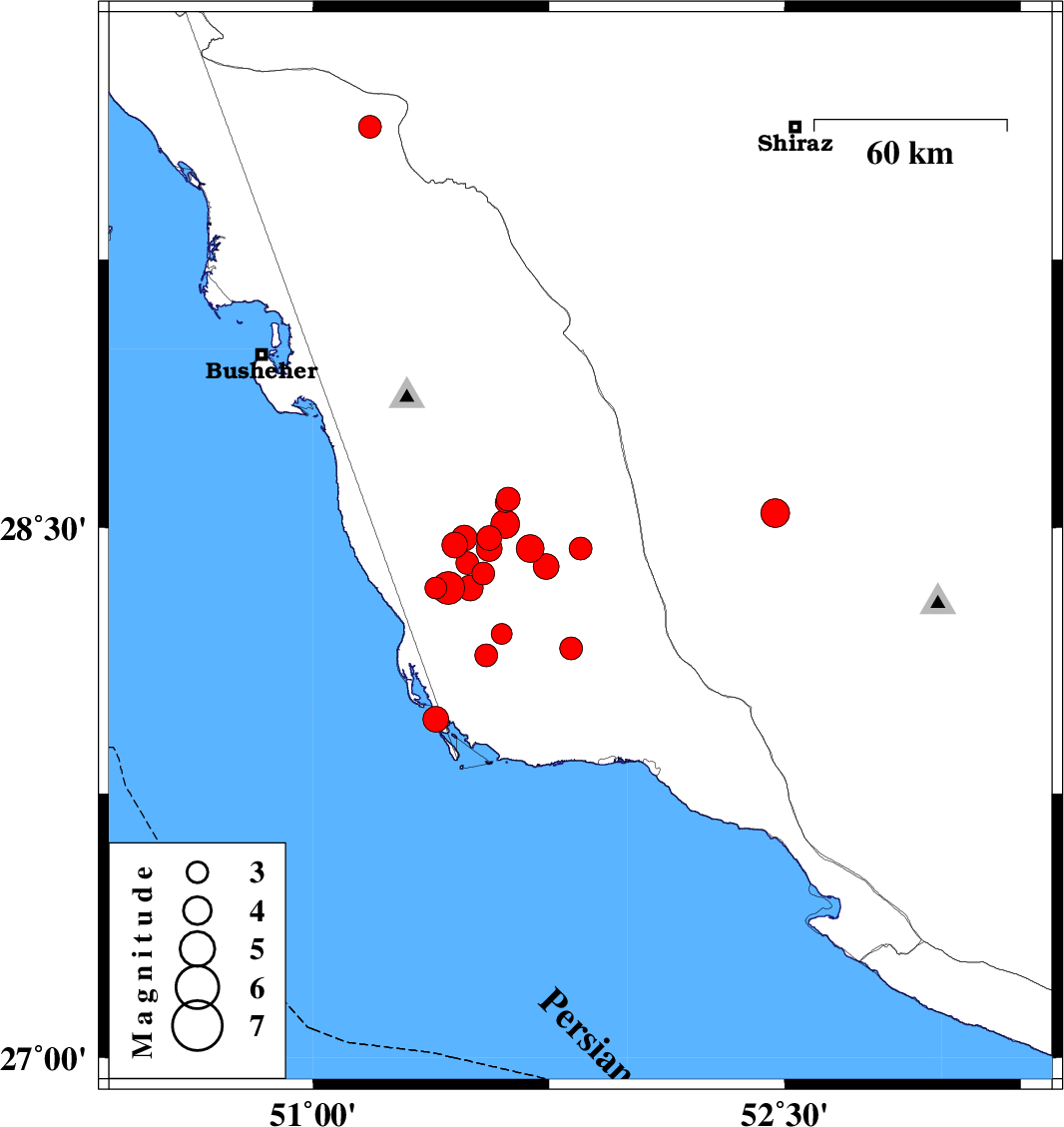 | 2013/04/27 | 11:07:17.8 | 15:37:17.8 | 27.96 | 51.39 | 28 | ML3.6 | Persian Gulf, 77 km South of Khormog | ||
