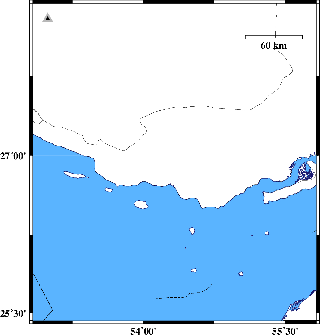 | 2013/04/19 | 21:41:05.3 | 02:11:05.3 | 26.99 | 53.94 | 34 | ML5 | Hormozgan Province, 48 km South-West of Bastak |