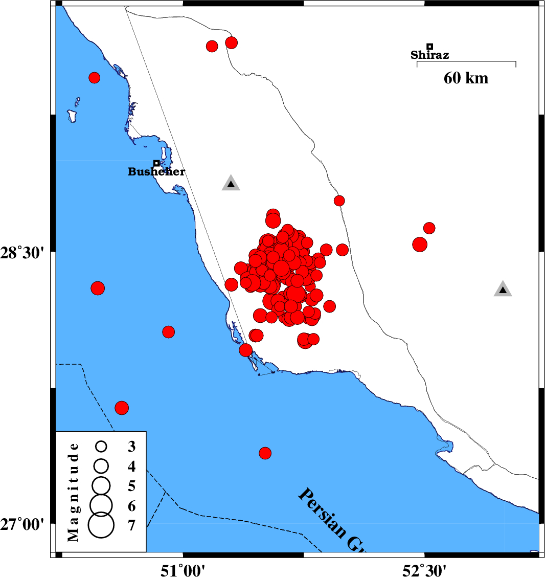 | 2013/04/19 | 18:32:57.5 | 23:02:57.5 | 28.42 | 51.49 | 29 | ML4 | Bushehr Province, 28 km South-East of Khormog | ||