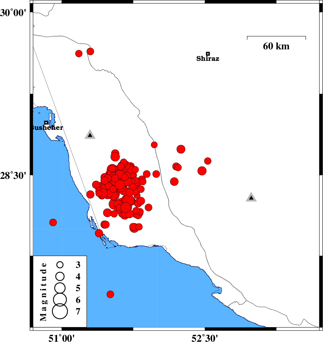 | 2013/04/09 | 14:44:54.2 | 19:14:54.2 | 28.52 | 51.53 | 30 | ML4.6 | Bushehr Province, 21 km South-East of Khormog | ||