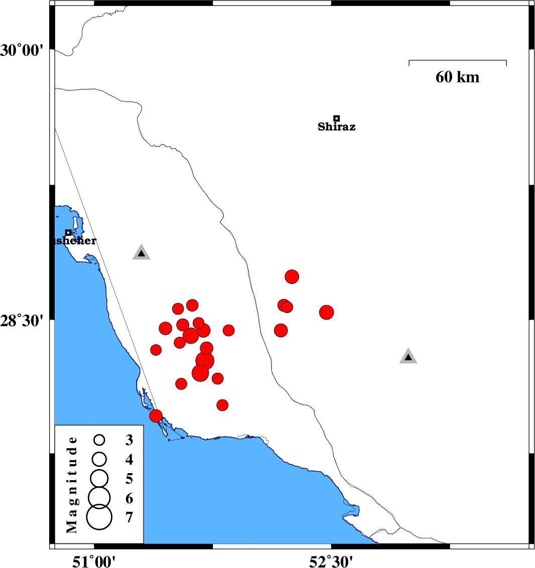 | 2013/04/27 | 11:07:17.8 | 15:37:17.8 | 27.96 | 51.39 | 28 | ML3.6 | Persian Gulf, 77 km South of Khormog | ||