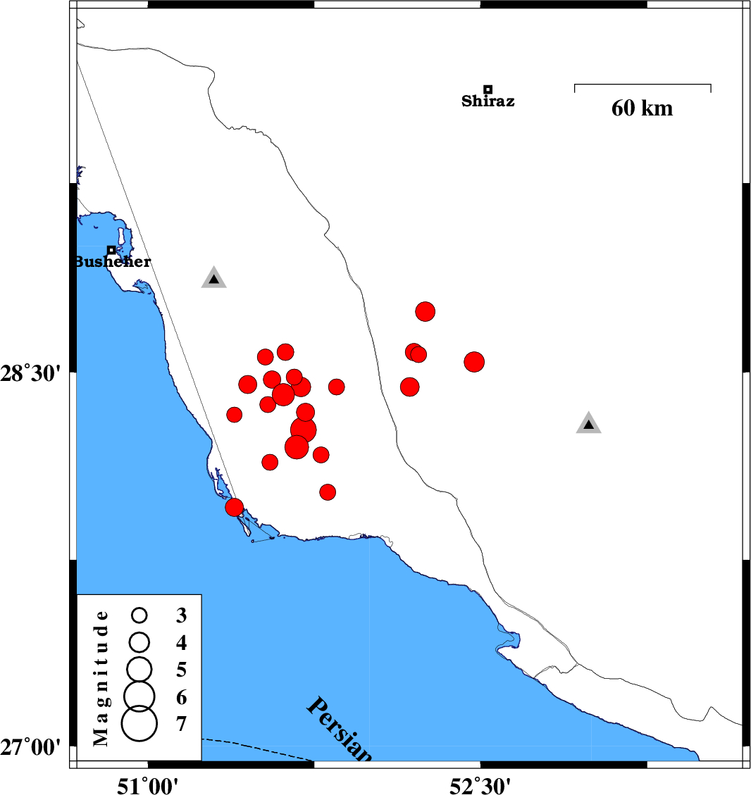 | 2013/04/27 | 11:07:17.8 | 15:37:17.8 | 27.96 | 51.39 | 28 | ML3.6 | Persian Gulf, 77 km South of Khormog | ||