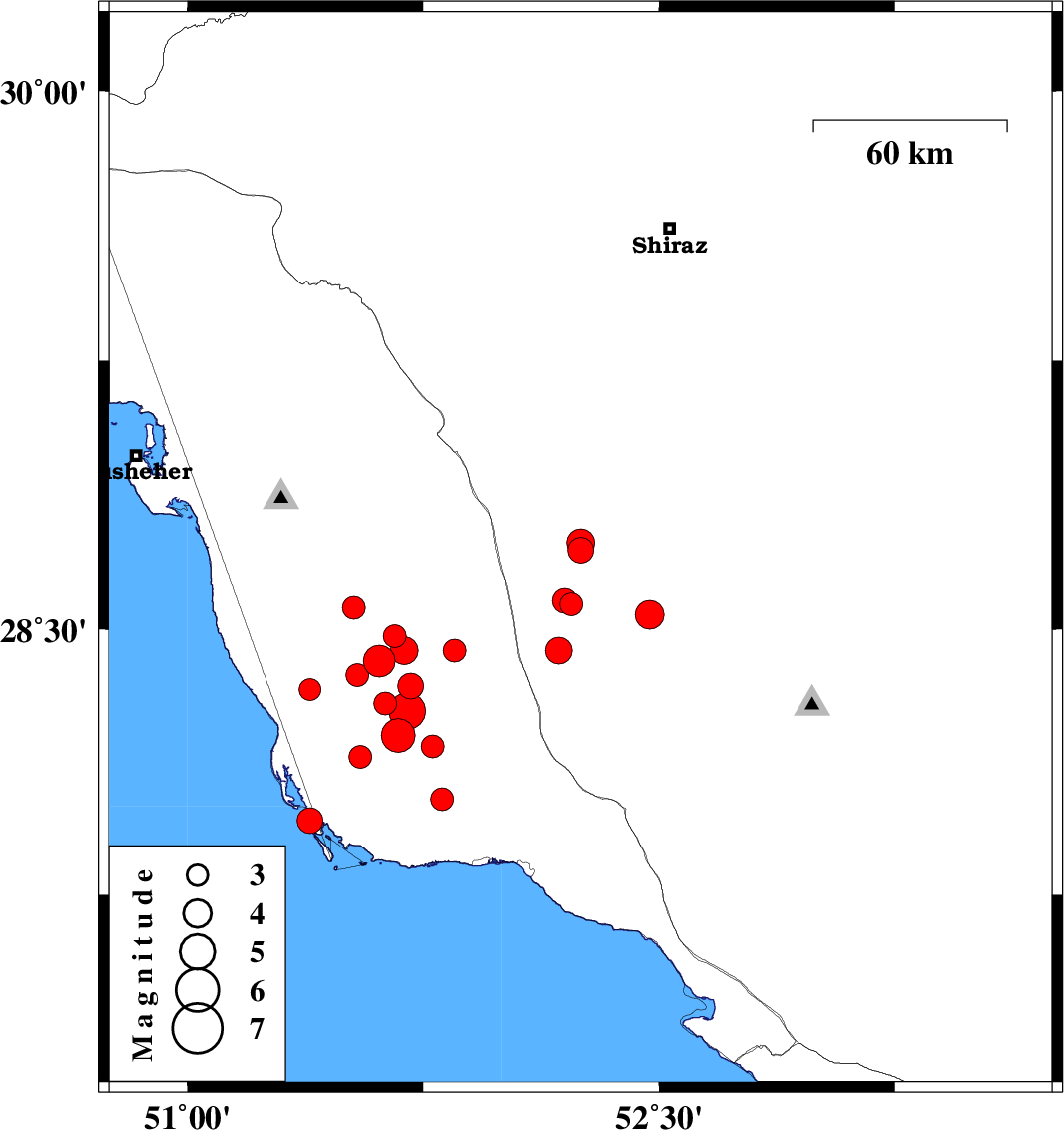 | 2013/04/27 | 11:07:17.8 | 15:37:17.8 | 27.96 | 51.39 | 28 | ML3.6 | Persian Gulf, 77 km South of Khormog | ||