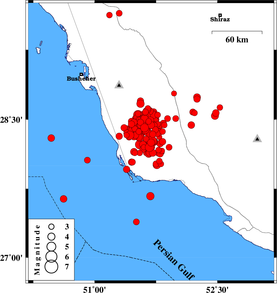 | 2013/04/27 | 11:07:17.8 | 15:37:17.8 | 27.96 | 51.39 | 28 | ML3.6 | Persian Gulf, 77 km South of Khormog | ||