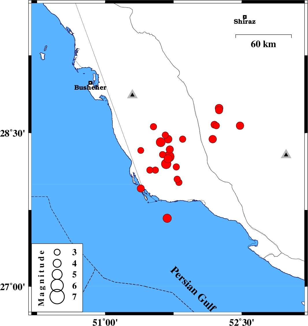 | 2013/05/04 | 00:09:54.7 | 04:39:54.7 | 28.25 | 51.69 | 30 | ML4.1 | Bushehr Province, 54 km South-East of Khormog | ||
