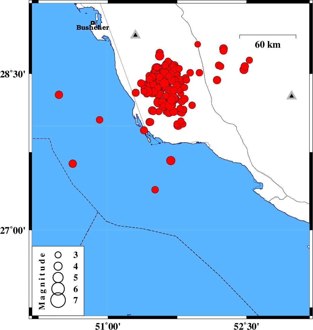 | 2013/04/09 | 14:44:54.2 | 19:14:54.2 | 28.52 | 51.53 | 30 | ML4.6 | Bushehr Province, 21 km South-East of Khormog | ||