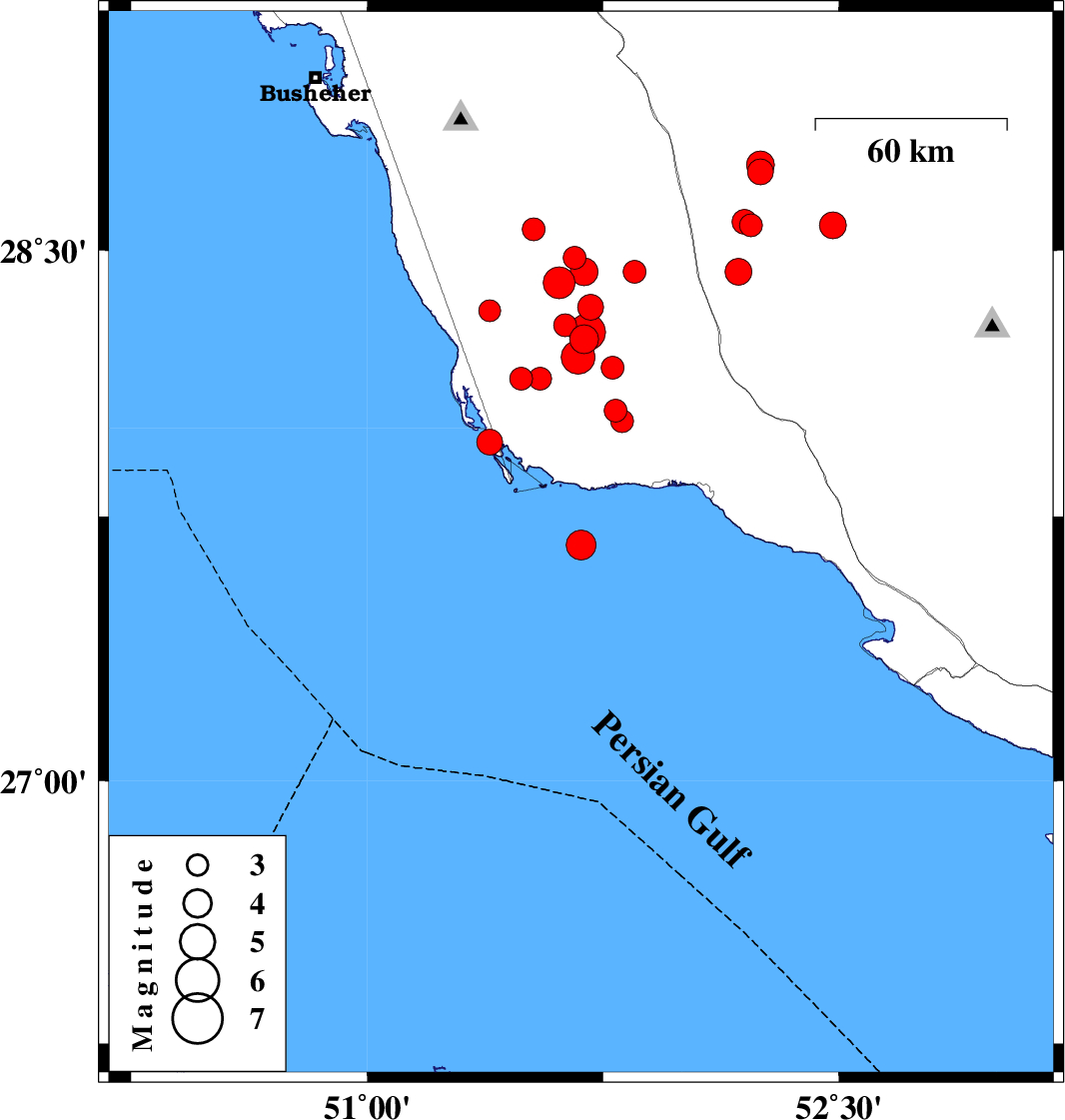 | 2013/04/27 | 04:05:21.4 | 08:35:21.4 | 28.44 | 51.69 | 9 | ML4 | Bushehr Province, 39 km South-East of Khormog |