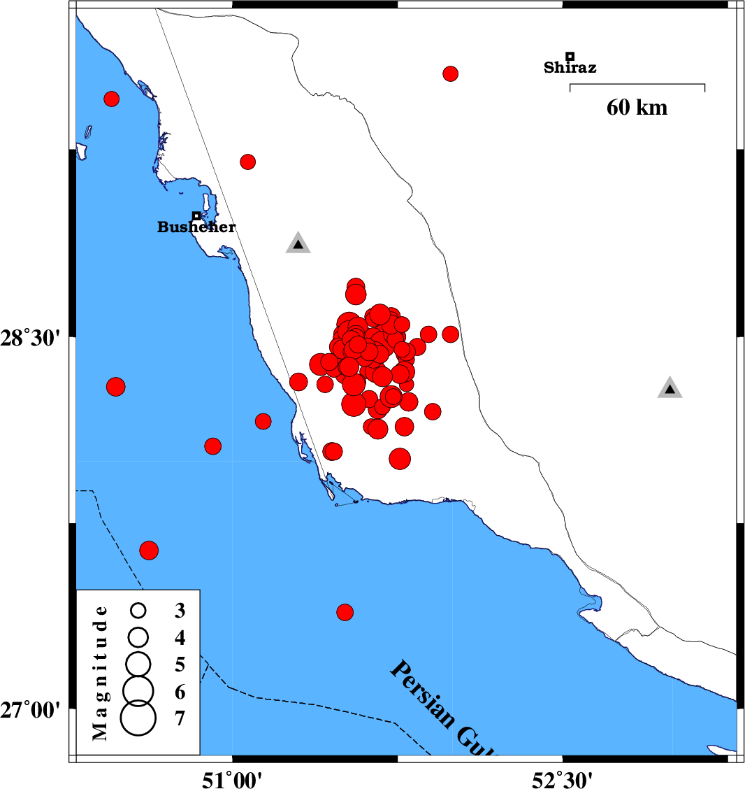 2013/04/09 22:20:45.9 02:50:45.9 28.4551.525 ML4 Bushehr Province, 26 km South-East of Khormog