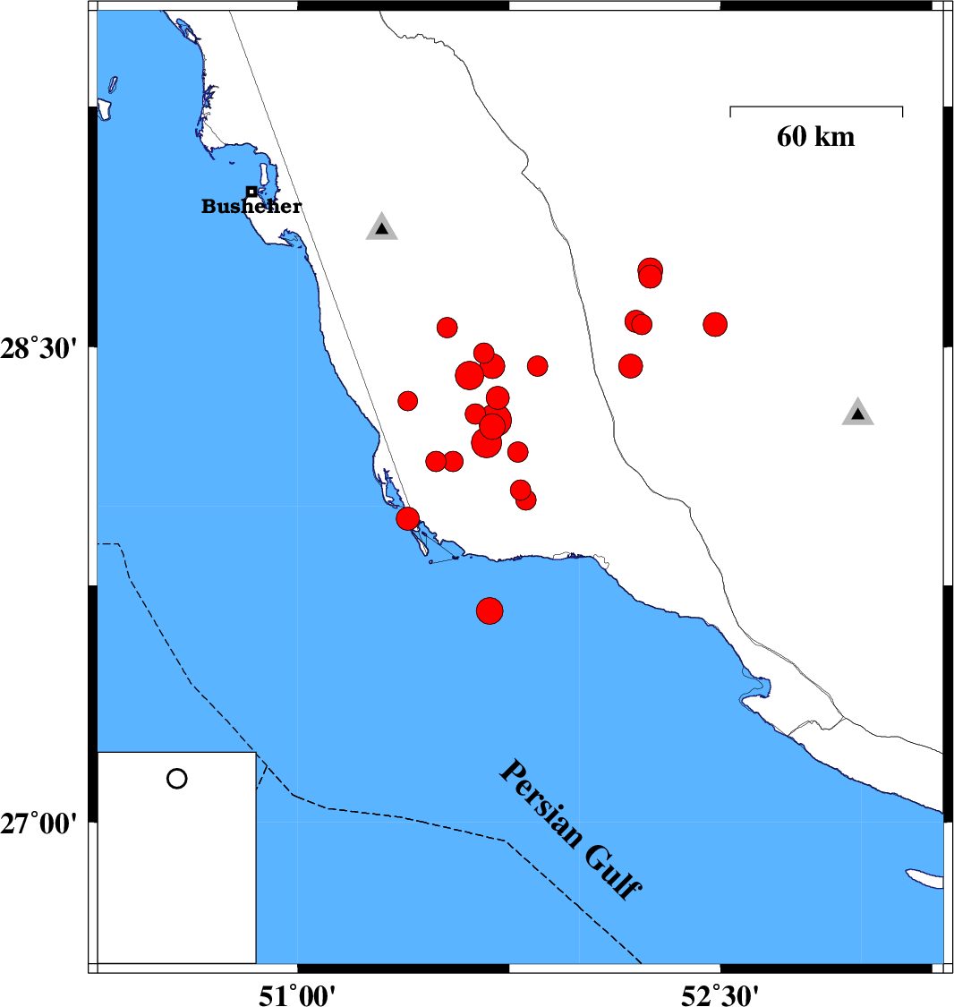 | 2013/04/27 | 11:07:17.8 | 15:37:17.8 | 27.96 | 51.39 | 28 | ML3.6 | Persian Gulf, 77 km South of Khormog | ||