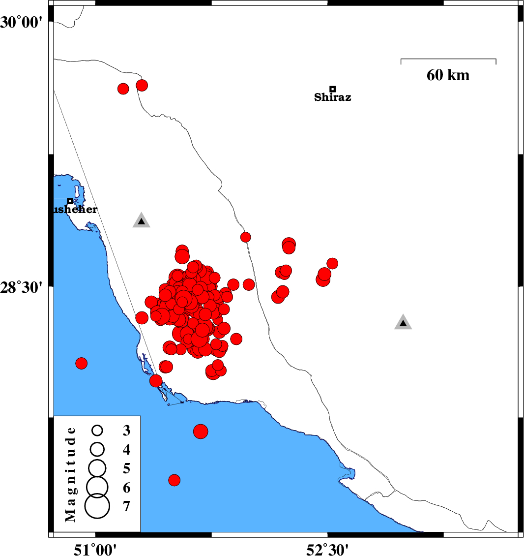 | 2013/04/19 | 15:44:12.6 | 20:14:12.6 | 28.78 | 51.97 | 17 | ML3 | Bushehr Province, 16 km West of Farashband | ||