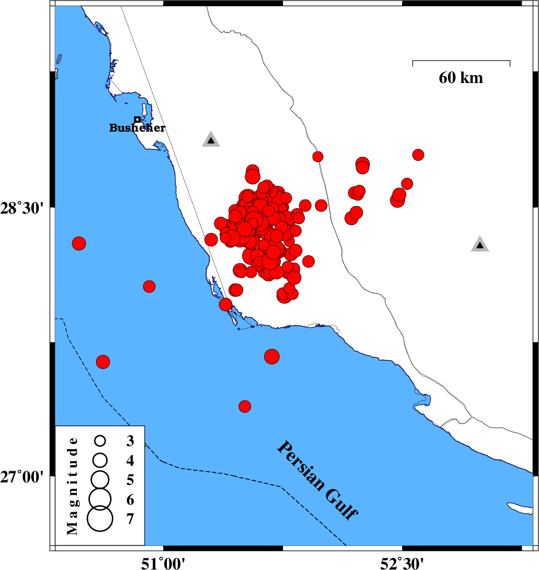| 2013/04/19 | 18:32:57.5 | 23:02:57.5 | 28.42 | 51.49 | 29 | ML4 | Bushehr Province, 28 km South-East of Khormog | ||