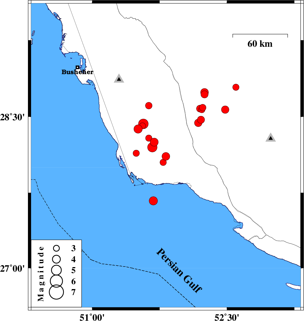 | 2013/05/04 | 00:09:54.7 | 04:39:54.7 | 28.25 | 51.69 | 30 | ML4.1 | Bushehr Province, 54 km South-East of Khormog | ||