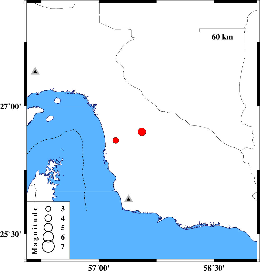 | 2013/05/09 | 08:01:32.8 | 12:31:32.8 | 26.7 | 57.56 | 15 | ML4.7 | Hormozgan Province, 79 km South of Manujan |