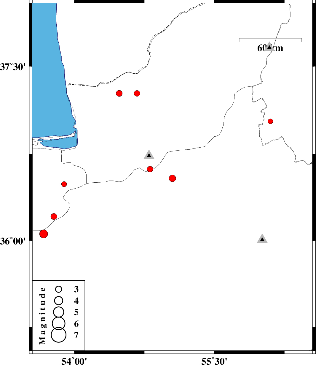 | 2013/05/09 | 21:10:06.3 | 01:40:06.3 | 36.54 | 55.05 | 14 | ML3.2 | Semnan Province, 15 km North of Shahrud | ||