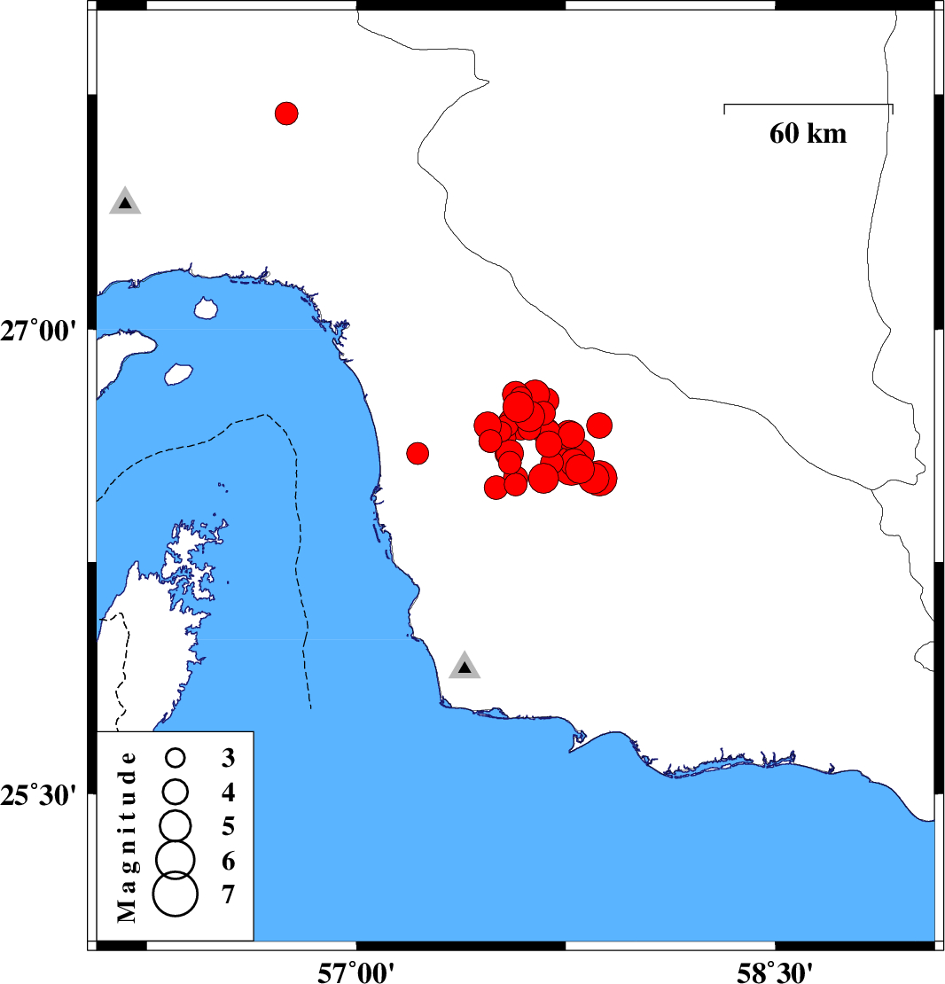 | 2013/05/11 | 03:09:48.1 | 07:39:48.1 | 26.52 | 57.87 | 15 | Ms5.7 | Hormozgan Province, 99 km North-East of Jask | ||