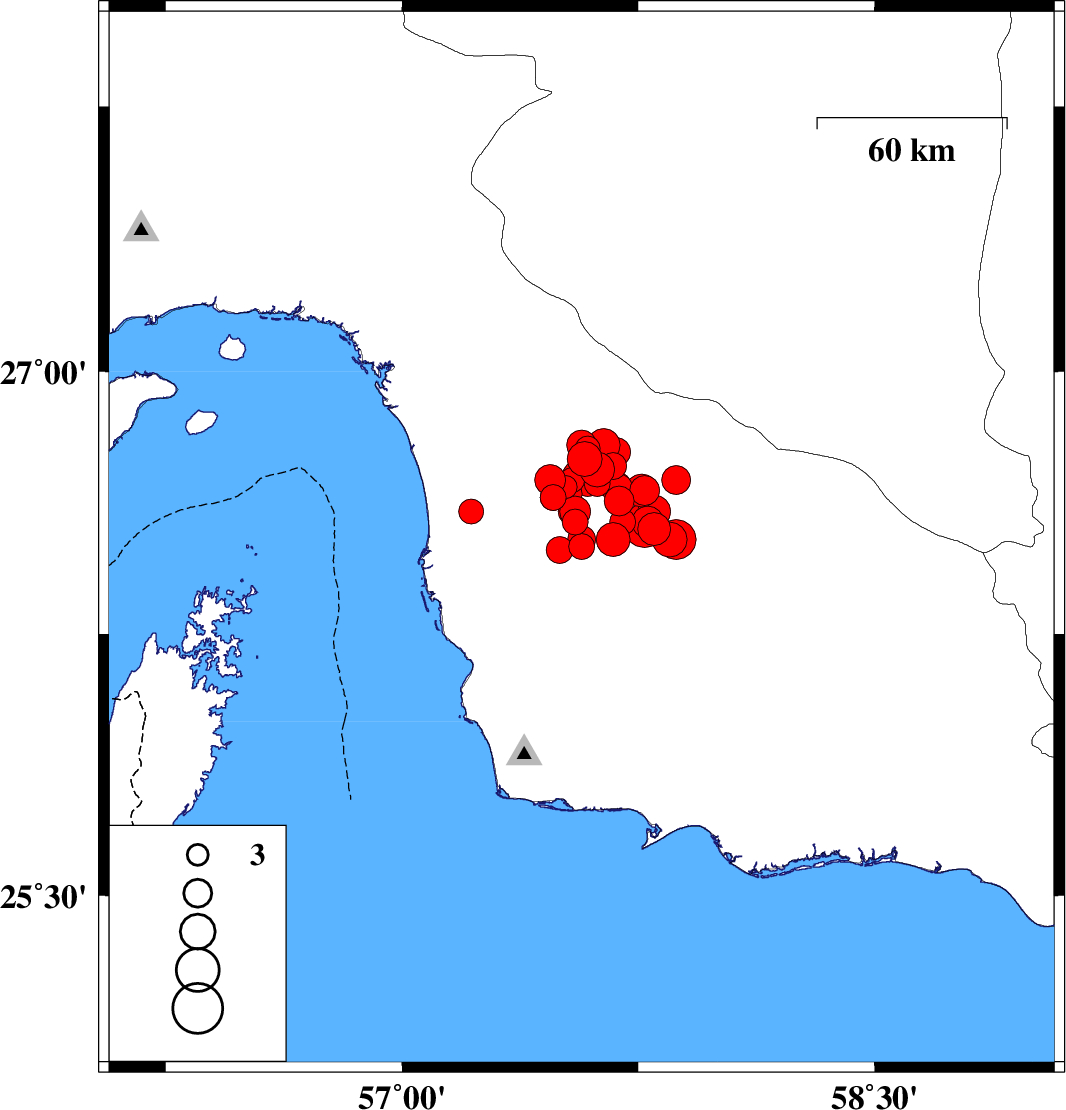 2013/05/11 22:28:08.5 02:58:08.5 26.6957.4714 ML4.4 Hormozgan Province, 80 km South of Manujan