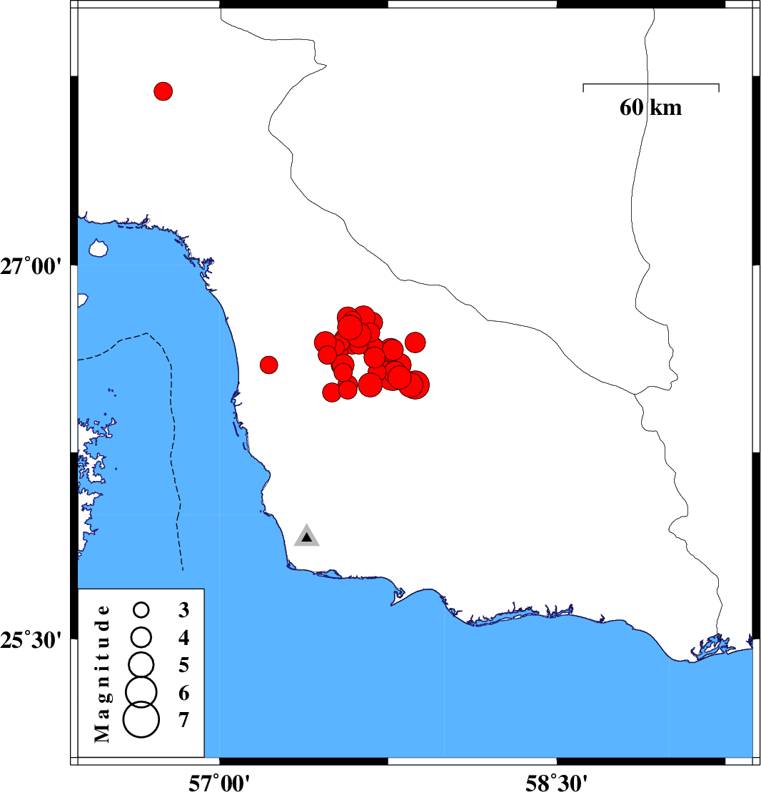 | 2013/05/11 | 03:09:48.1 | 07:39:48.1 | 26.52 | 57.87 | 15 | Ms5.7 | Hormozgan Province, 99 km North-East of Jask | ||