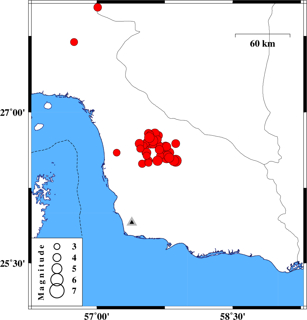 | 2013/05/11 | 04:09:27.9 | 08:39:27.9 | 26.55 | 57.8 | 15 | ML4.7 | Hormozgan Province, 102 km North of Jask | ||