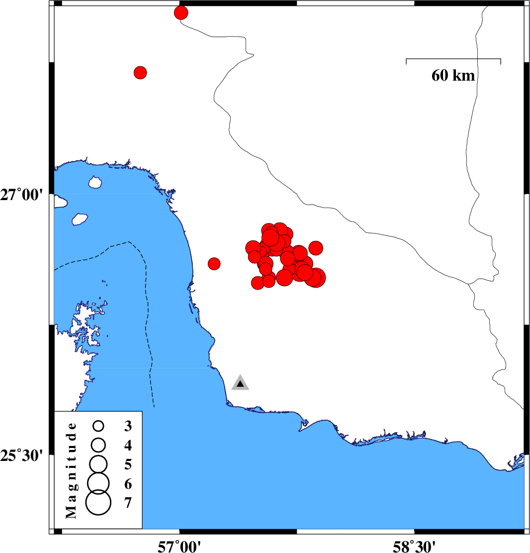 | 2013/05/11 | 04:09:27.9 | 08:39:27.9 | 26.55 | 57.8 | 15 | ML4.7 | Hormozgan Province, 102 km North of Jask | ||