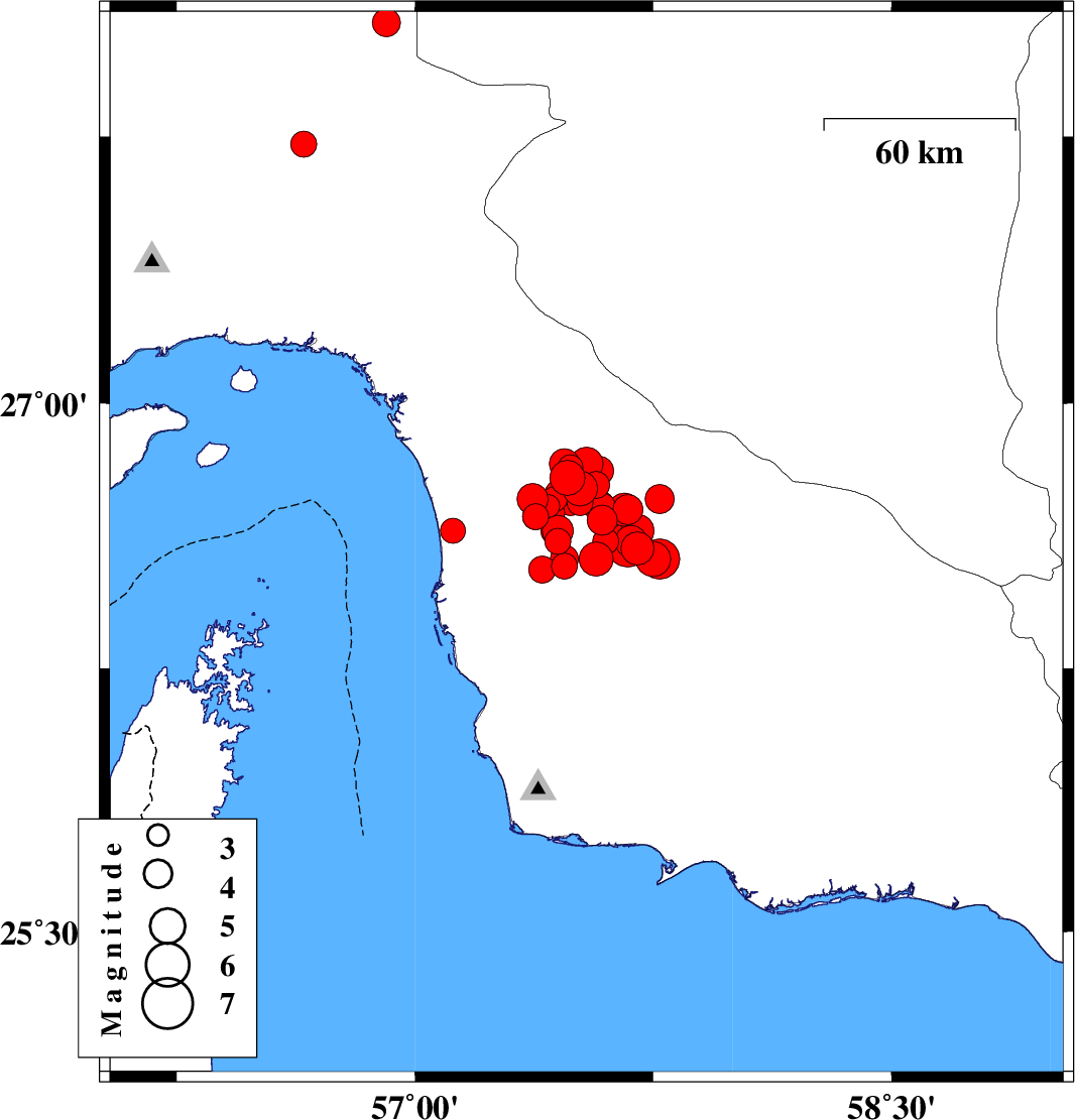 2013/05/11 02:49:34.5 07:19:34.5 26.6957.5915 ML4.7 Hormozgan Province, 80 km South of Manujan