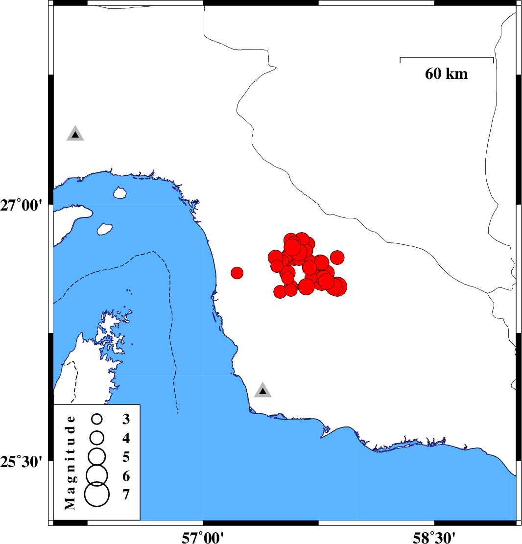 2013/05/11 02:08:08.5 06:38:08.5 26.5657.7715 Ms6.2 Hormozgan Province, 103 km North of Jask