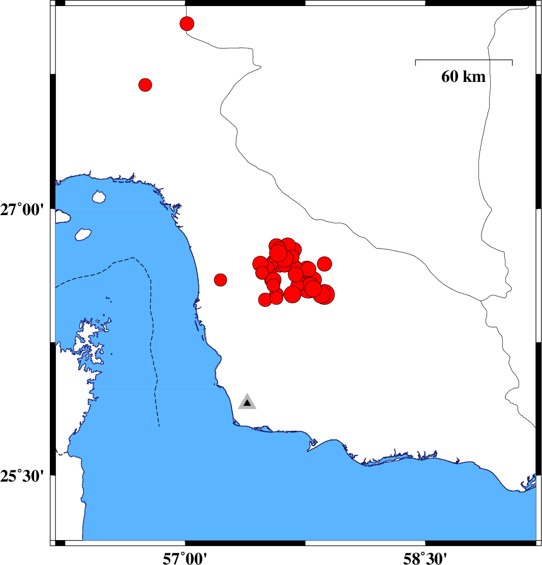 | 2013/05/11 | 04:09:27.9 | 08:39:27.9 | 26.55 | 57.8 | 15 | ML4.7 | Hormozgan Province, 102 km North of Jask | ||