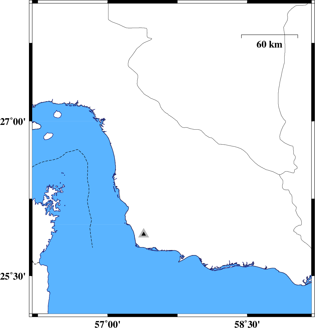 | 2013/05/11 | 02:08:08.5 | 06:38:08.5 | 26.56 | 57.77 | 15 | Ms6.2 | Hormozgan Province, 103 km North of Jask | ||