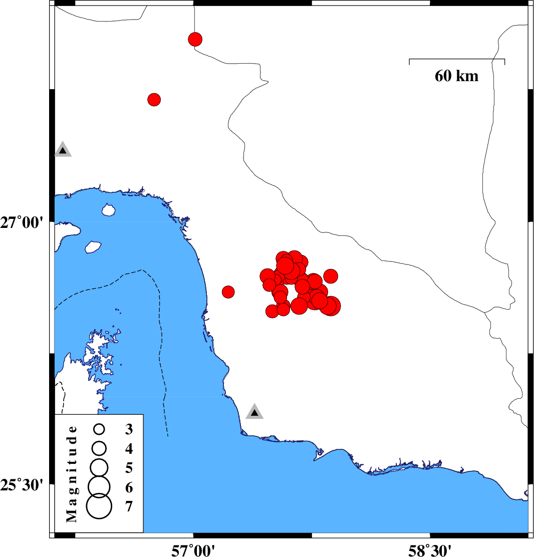 | 2013/05/11 | 04:09:27.9 | 08:39:27.9 | 26.55 | 57.8 | 15 | ML4.7 | Hormozgan Province, 102 km North of Jask | ||
