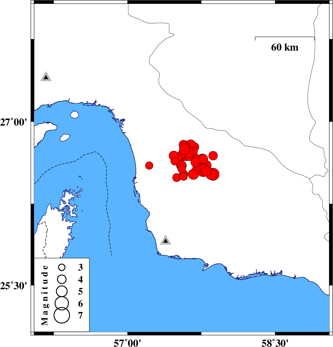2013/05/11 02:08:08.5 06:38:08.5 26.5657.7715 Ms6.2 Hormozgan Province, 103 km North of Jask