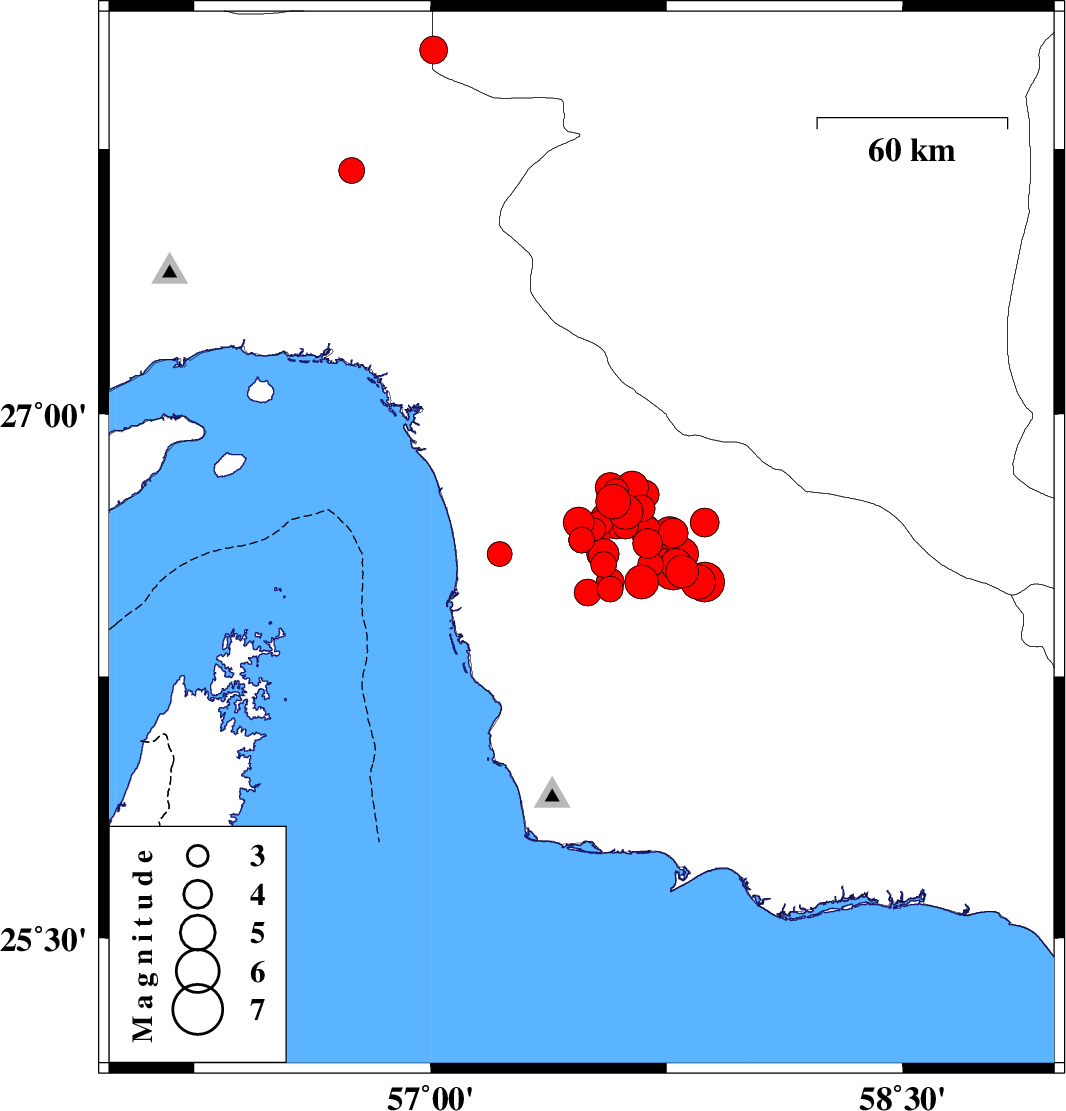 | 2013/05/11 | 04:09:27.9 | 08:39:27.9 | 26.55 | 57.8 | 15 | ML4.7 | Hormozgan Province, 102 km North of Jask | ||