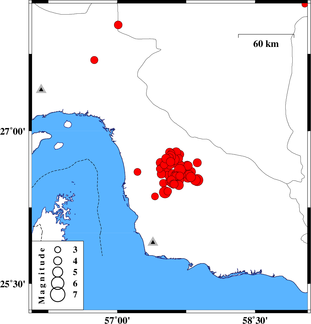 | 2013/05/11 | 03:09:48.1 | 07:39:48.1 | 26.52 | 57.87 | 15 | Ms5.7 | Hormozgan Province, 99 km North-East of Jask | ||