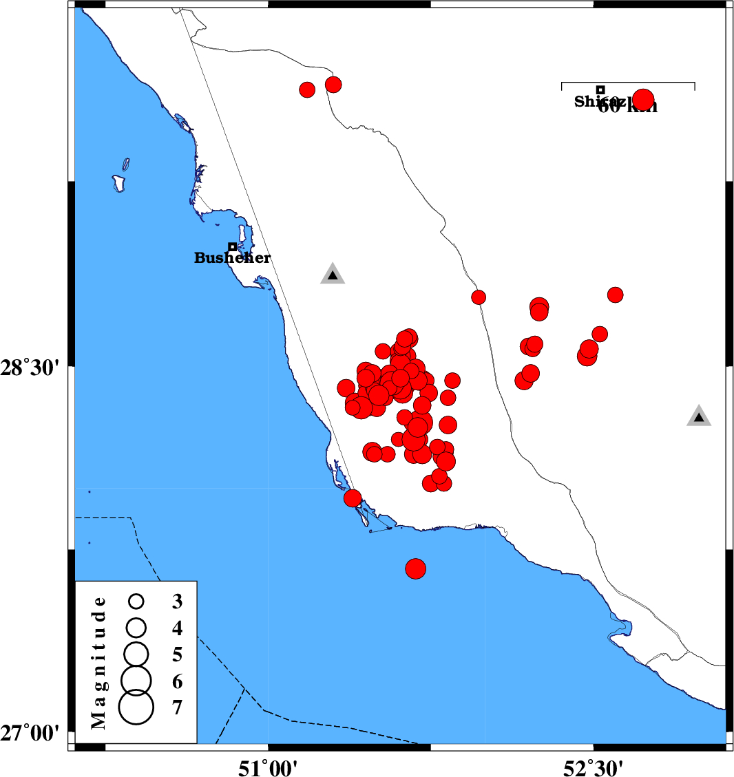| 2013/04/19 | 18:32:57.5 | 23:02:57.5 | 28.42 | 51.49 | 29 | ML4 | Bushehr Province, 28 km South-East of Khormog | ||