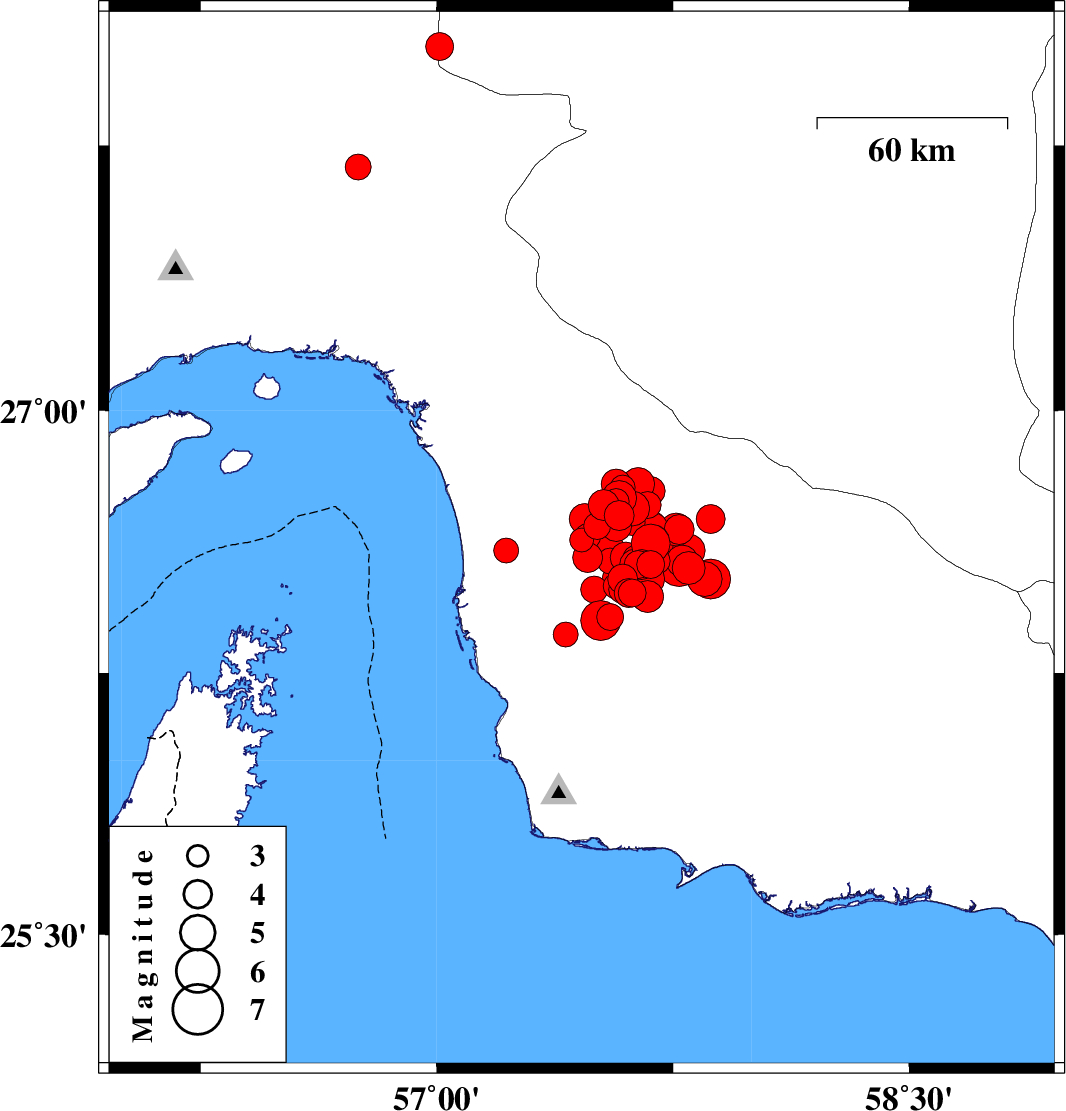 | 2013/05/11 | 03:09:48.1 | 07:39:48.1 | 26.52 | 57.87 | 15 | Ms5.7 | Hormozgan Province, 99 km North-East of Jask | ||