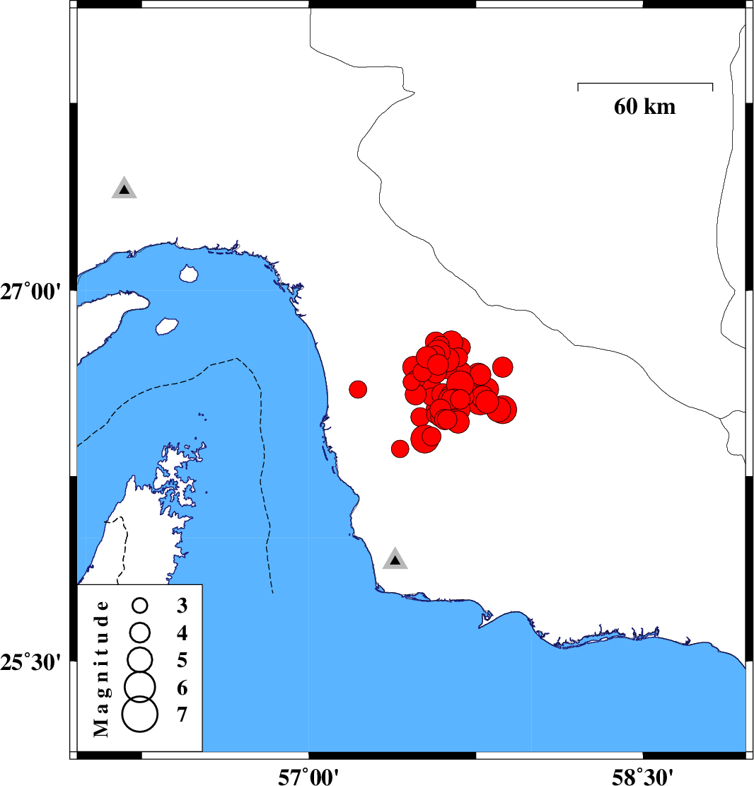 2013/05/11 02:49:34.5 07:19:34.5 26.6957.5915 ML4.7 Hormozgan Province, 80 km South of Manujan